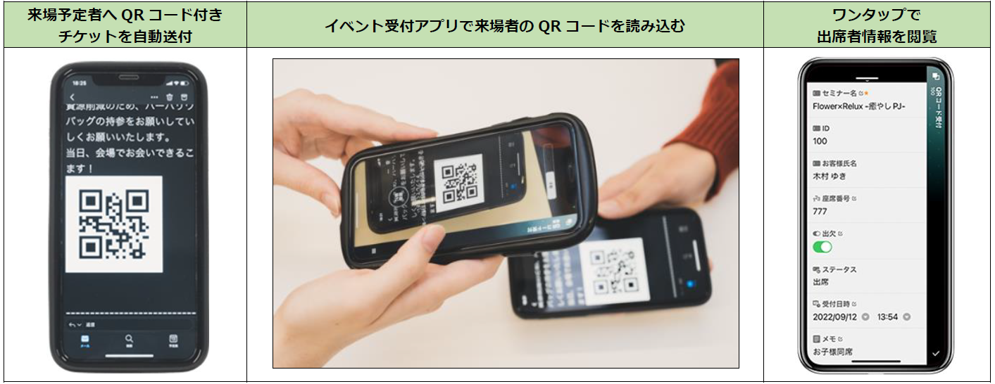 体験学習では、プログラミング未経験の学生がPlatioで「イベント受付アプリ」をわずか1時間で作成。チケットを電子化し、QRコードを読み取るだけの操作でイベント参加者約100名のスムーズな受付を実現しました。また、紙チケットの全廃により印刷費や配送コストも削減。実際のイベントで活用するアプリを作成から運用まで実践したことで、課題の抽出や業務改善の提案などの学びにつながりました。