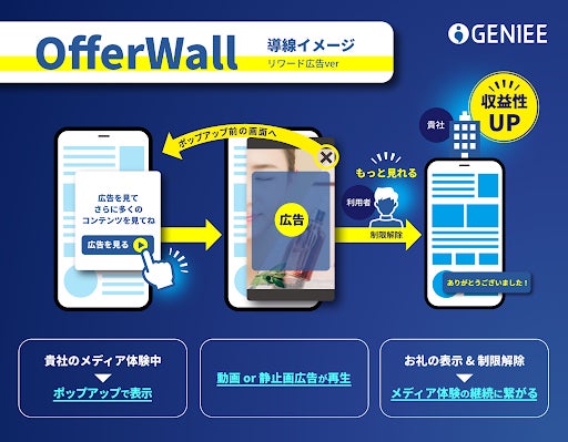この流れを受けて、Google Ad Managerでは新たな広告フォーマットとして「オファーウォール」広告のベータ版の提供を開始しました。これに伴い、ジーニーは実装までのサポートや導線設計のコンサルティングを行い、パブリッシャー様はユーザーの興味や関心に応じたオファーを表示することでWebサイトの収益を高めることが期待できます。