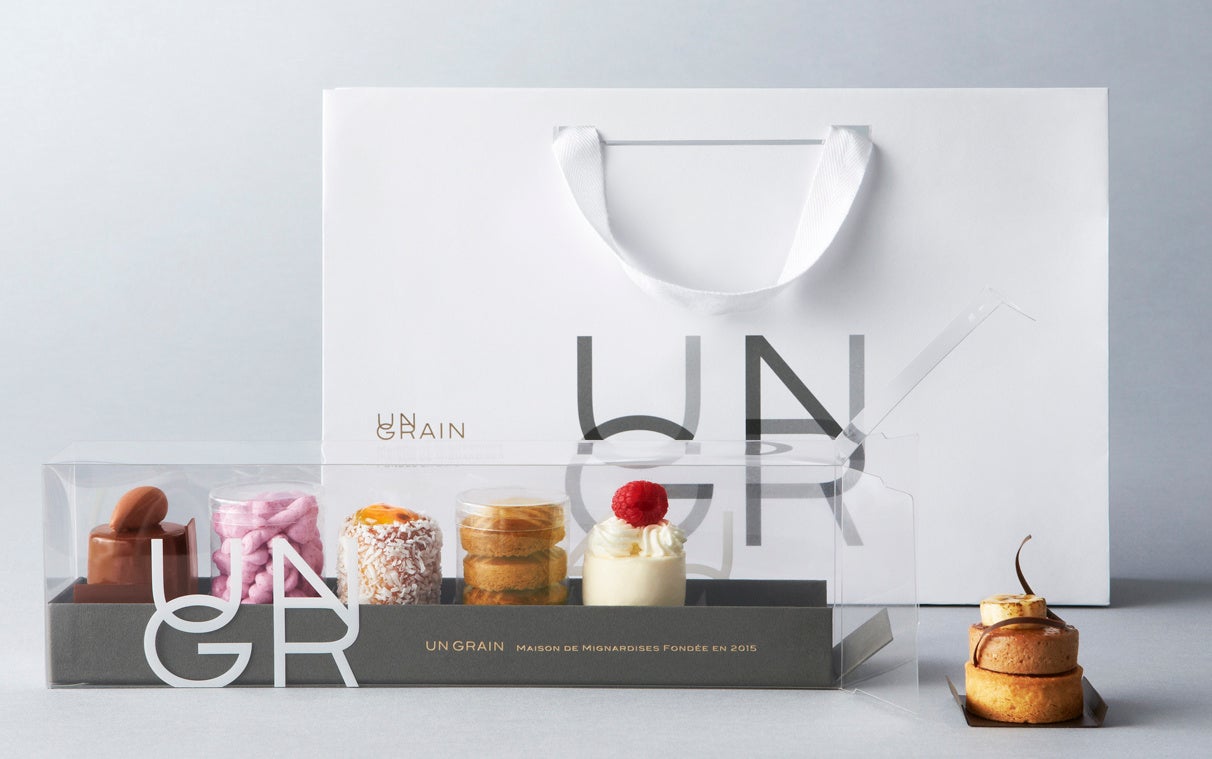 フランス語で「上品さ、可憐さ」という意味を持つ、ひとつまみサイズのお菓子のこと。一般的にフレンチでコース料理の締めくくりとして食後の飲み物とともに提供される小菓子のことを指しますがUN GRAINでは食後に限らず、家族や友人など大切な人たちと過ごすひとときにおもてなしの心を表してくれる、小さくシックなお菓子を総称して呼んでいます。