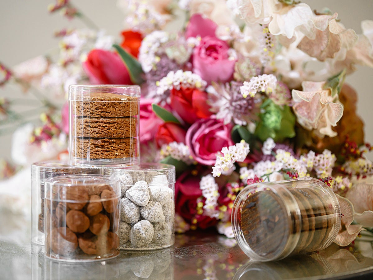 定番2品に限定4品を加えたクッキーの詰め合わせは、素材の持つ魅力とカカオの豊かな風味を融合したハーモニーが堪能できます。食べやすいひとつまみサイズはバレンタインの贈り物としてはもちろん、大切な友人やパートナーとシェアして楽しむティータイムにもおすすめ。期間中はオープン以来お付き合いのあるgigi fleuriste様が手がける店内装花で皆さまをお迎えします。