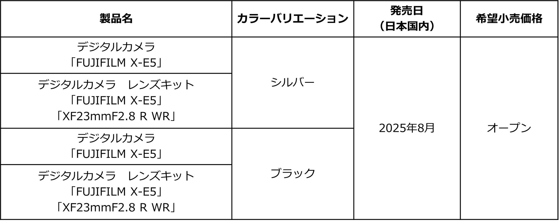 富士フイルム株式会社(本社:東京都港区、代表取締役社長・CEO:後藤 禎一)は、独自の色再現技術による卓越した画質と小型軽量を実現する「Xシリーズ」の最新モデルとして、ミラーレスデジタルカメラ「FUJIFILM X-E5」(以下「X-E5」)を2025年8月より発売します。