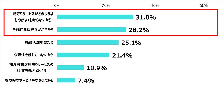 4.利用したことがない、もしくは利用を取りやめた理由は、「見守りサービスがどのようなものかよくわからないから(31.0%)」、「金銭的な負担がかかるから(28.2%)」が上位