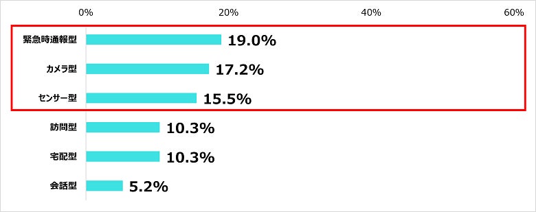 次いで映像・画像などで見守る「カメラ型(17.2%)」、赤外線センサー、電気ポットや冷蔵庫など家電連動型を含む「センサー型(15.5%)」が上位。自治体や行政、郵便局や電気・ガス・水道関連会社などが訪問する「訪問型」や食事宅配などの「宅配型」は10.3%と、他者が自宅を訪問するサービスは利用率がやや低い傾向となった。