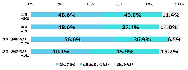 被介護者と介護家族の居住形態別の調査では、同居の場合は48.6%、別居の場合は56.6%、施設介護の場合は40.4%が「関心がある」と回答した。