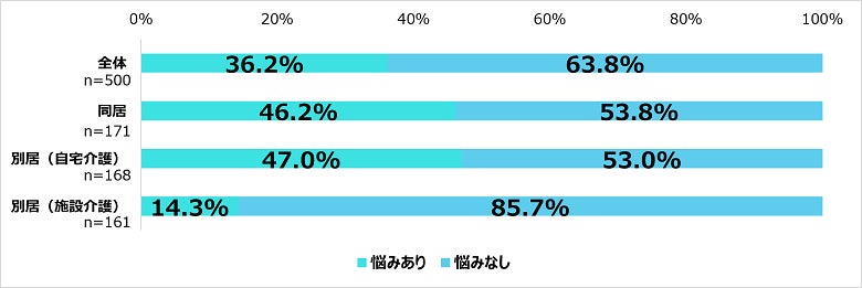 被介護者と介護家族の居住形態別の調査では、同居の場合は46.2%、別居の場合は47.0%、施設介護の場合は14.3%が「悩みあり」と回答。同居・別居での介護は見守りへの悩みが多い傾向にあることがわかった。