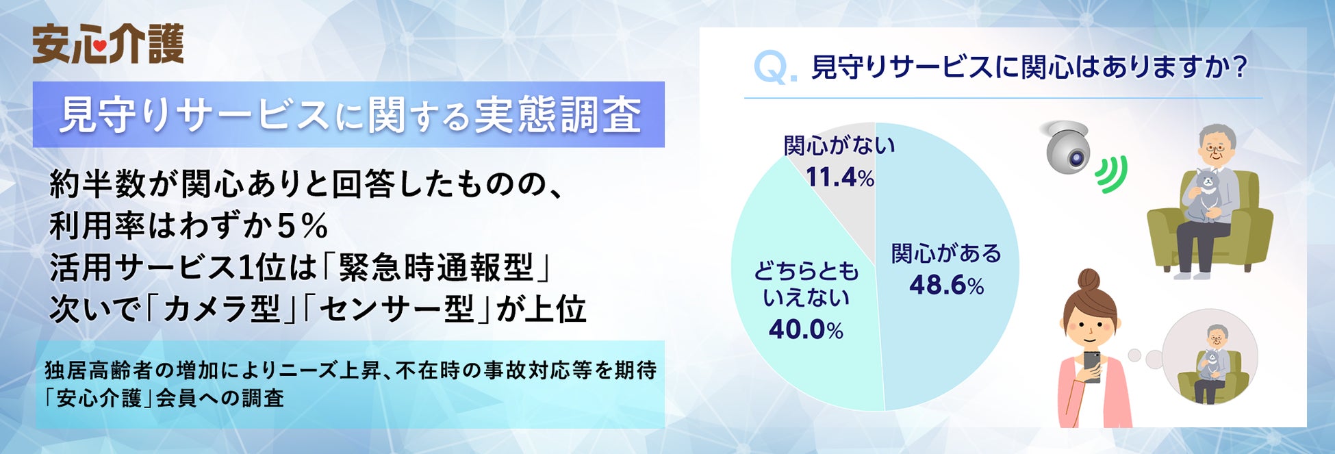 【介護家族500名に聞いた見守りサービスに関する実態調査】約半数が関心ありと回答したものの、利用率はわずか5%。活用サービス1位は「緊急時通報型」次いで「カメラ型」「センサー型」が上位