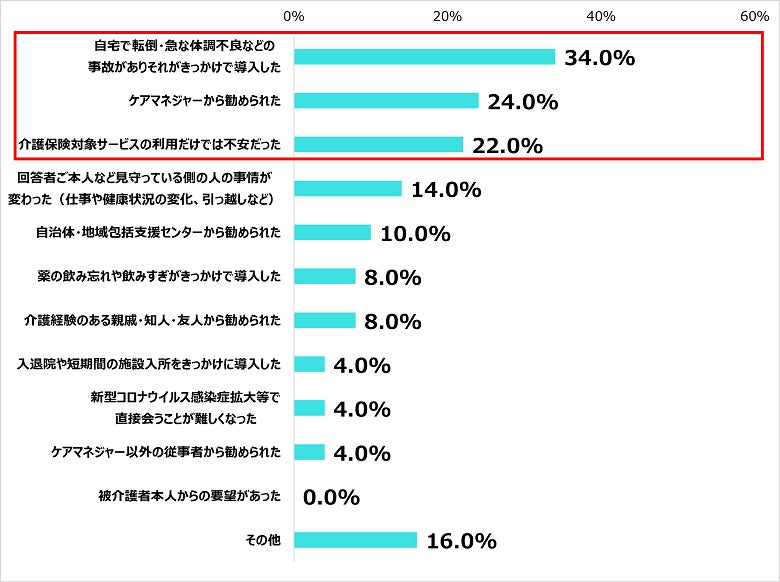 被介護者に何か起きる前の予防的な観点で利用しているというよりは、事故等を受けてその再発防止や対処のために導入することが多いことが示唆された。