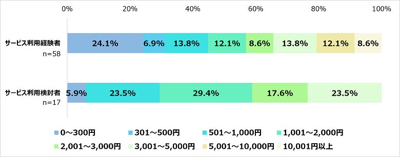 サービス利用検討者の検討金額は「1,001~2,000円(29.4%)」が最多。次いで501~1,000円と3,001~5,000円がそれぞれ23.5%だった。