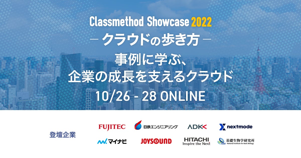 クラスメソッド株式会社(本社:東京都千代田区、代表取締役社長:横田 聡、以下「クラスメソッド」)は、クラウドを活用してビジネスに成果をあげている企業の最新事例と実践ノウハウを紹介するオンラインカンファレンス「Classmethod Showcase(クラスメソッド ショーケース) - クラウドの歩き方」を2022年10月26日(水)〜28日(金)に開催します。実際にビジネスでクラウドを活用している企業が登壇し、クラウドの導入を決めた背景や期待、実際の導入プロセス、運用にあたっての工夫や体制作りなど、実事例を紹介します。