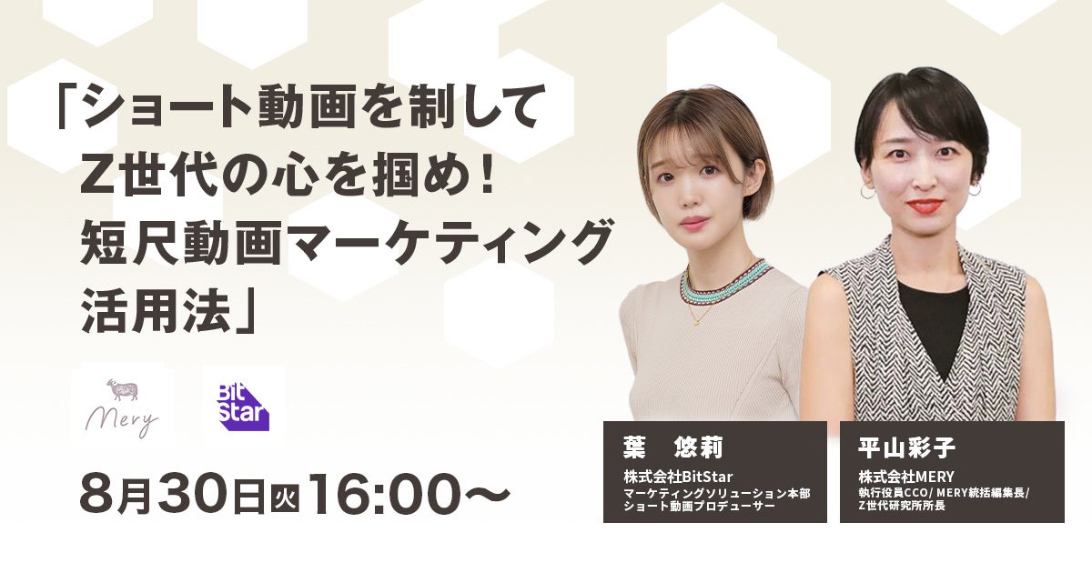 株式会社BitStar(本社:東京都渋谷区、代表取締役 社長執行役員CEO:渡邉拓、以下BitStar)と株式会社MERY(本社:東京都千代田区、代表取締役社長:藤田欣司、以下MERY)は、8月30日(火)16:00より企業さまへ向けた無料ウェビナー「ショート動画を制してZ世代の心を掴め!短尺動画マーケティング活用法」を共催いたします。