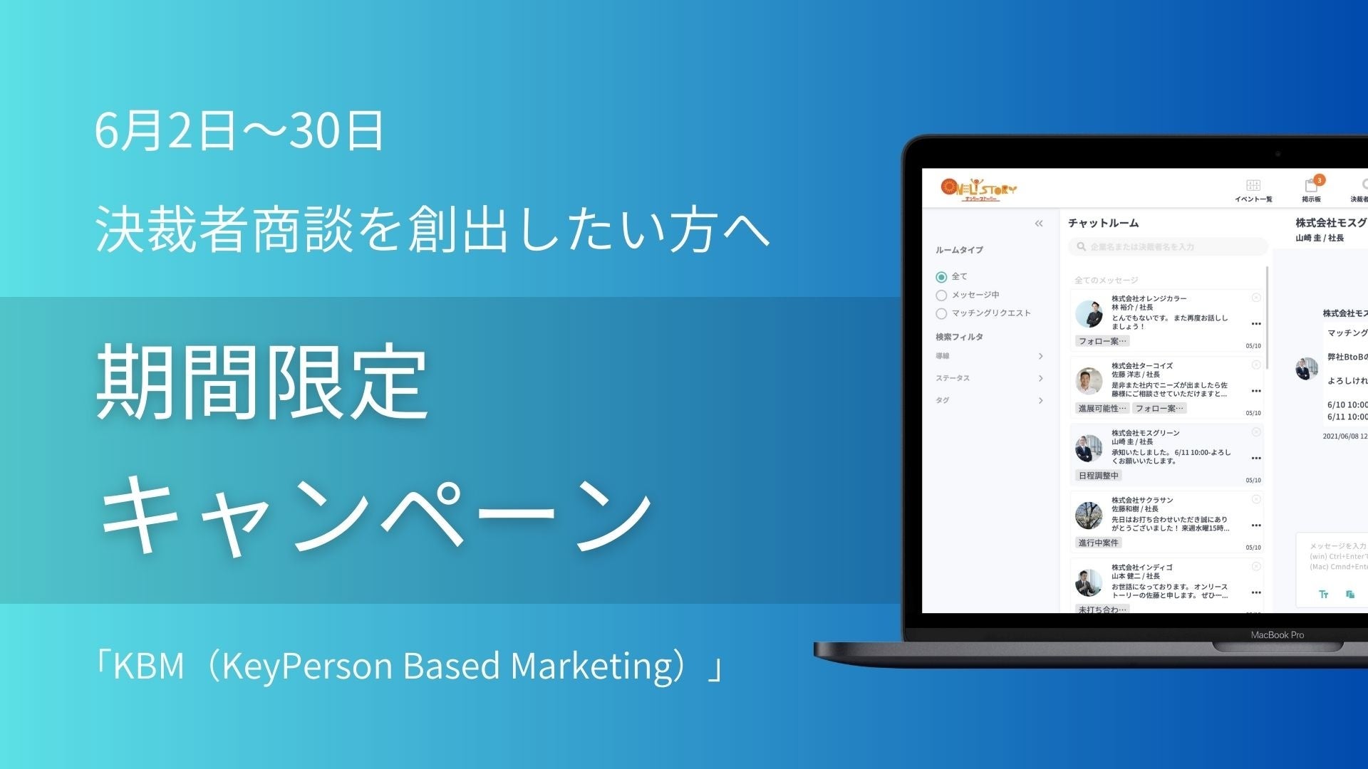 株式会社オンリーストーリーが提供する決裁者マッチングプラットフォームをご利用いただく企業様が増え、以前よりも幅広い成功事例が生まれてきました。より多くの方により気軽にご利用いただき、さらなる企業の成長を実現いただくために、キャンペーンを実施します。