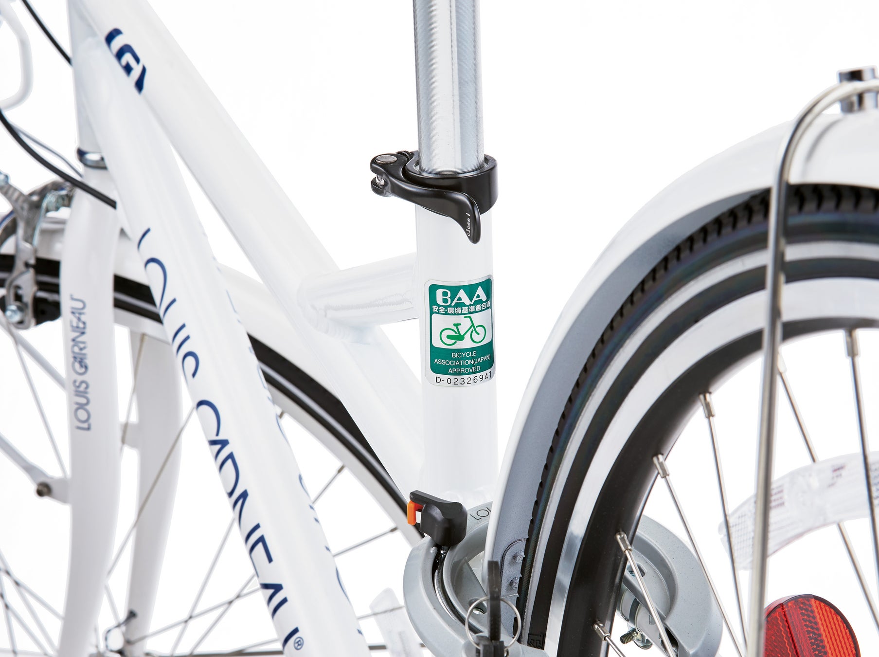 多くの車種で採用をしている「BAAマーク」は乗る人の安全を第一に考え、自転車安全基準に定められている(フレーム強度、ブレーキの制動性能、リフレクタの反射性能など)約90項目もの厳しい検査をクリアした自転車だけに貼付されている安全・安心で環境に優しい自転車の目印です。