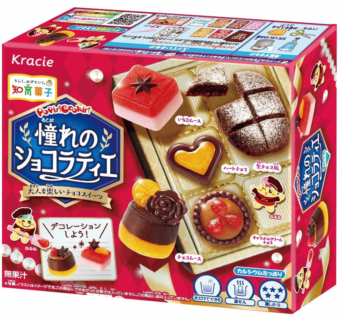 「ポッピンクッキン 憧れのショコラティエ」は、チョコと粉と水だけでショコラティエのように本格チョコスイーツ作りを楽しめる、知育菓子(R)です。「チョコムース」「いちごムース」「生チョコ風」「キャラメルクリームチョコ」「ハートチョコ」の5種類の本物そっくりなチョコスイーツを作れます。ポッピンクッキンの中で最も難易度が高く、大人も楽しめる商品です。