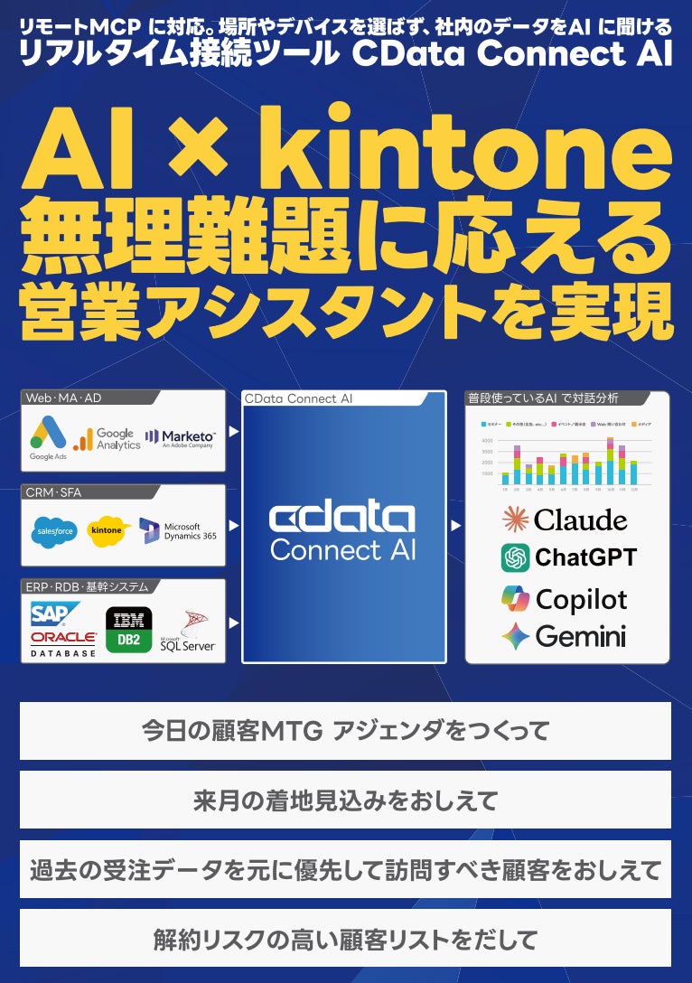そこでCData が提供するリモートMCP Server『CData Connect AI』を活用することで、ChatGPT やClaude などのAI エージェントからkintone をはじめとする業務システムにノーコードで接続し、現場の担当者からの「受注データを元に優先して訪問すべき顧客を教えて」といった自然な問いかけによる分析が可能になります。