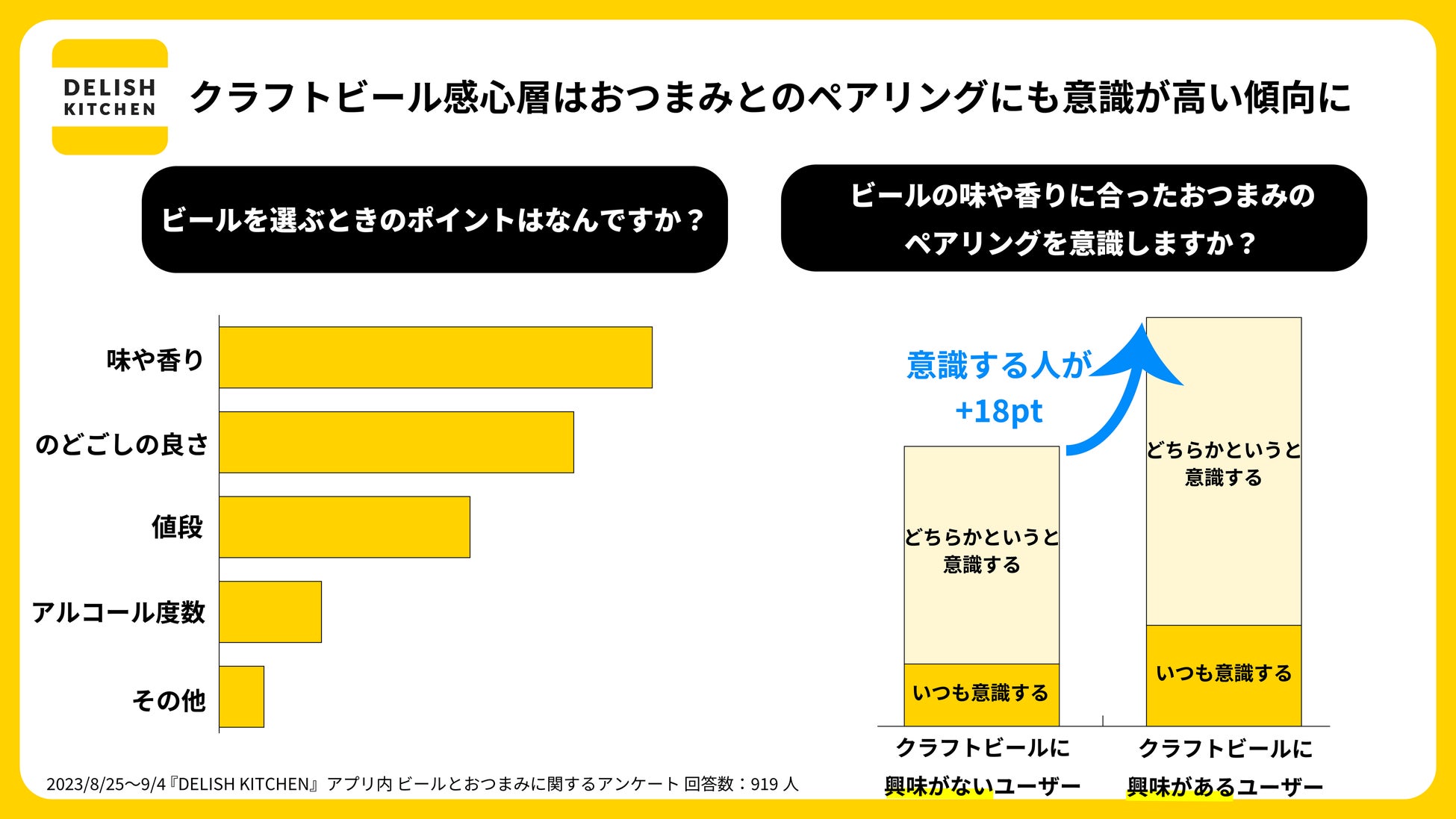 『DELISH KITCHEN』のアプリユーザーを対象にしたアンケートでは、ビールを選ぶ際のポイントについて、過半数が「味や香り」と回答しました。また、最近は味や香りに多様性のあるクラフトビールにも注目が集まっており、普段ビールを飲む人のうち75%以上がクラフトビールに「興味がある」と回答しました。