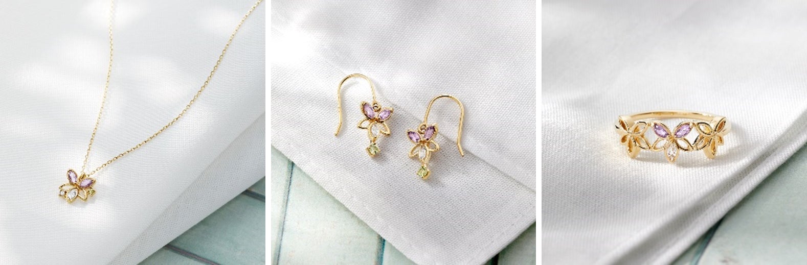 春の芽吹きを感じさせる庭先に、控えめに花を咲かせるスミレをイメージしたシリーズも。ミステリアスな紫色の花を透明感のあるアメシストのストーンで表現し、シンプルなデザインにより奥ゆかしいスミレの印象をジュエリーに落とし込みました。春らしさもありながら、大人の女性に似合う洗練されたアイテムは、デイリー使いにもぴったりです。