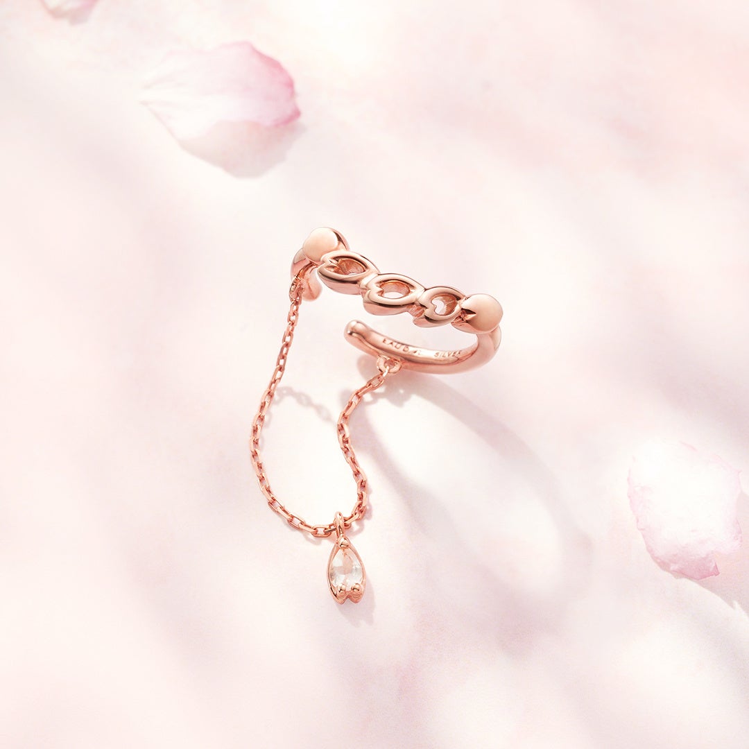 さらに、桜の花びらが舞う様子をEAU DOUCE4℃らしいカッティングで表現したピアスや、1石留められたペリドットで桜の木で羽を休める鶯をイメージした春らしいネックレスも。チェーンの先に花びらが揺れるイヤーカフは、横顔を明るく照らし出ます。