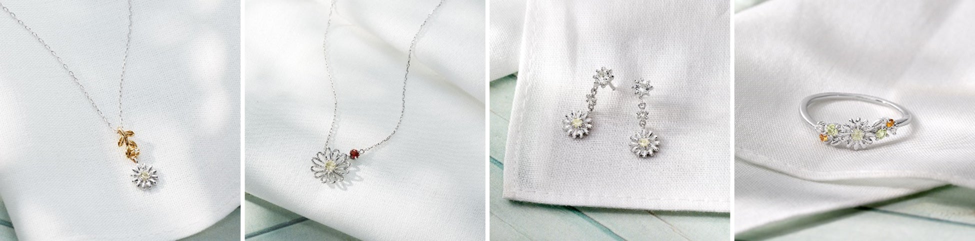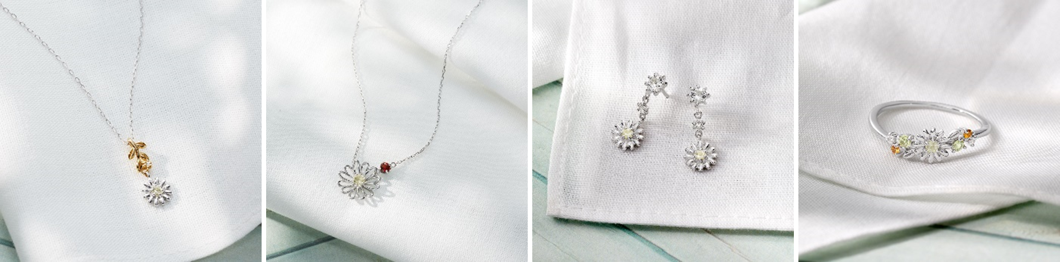 真っ白な花を咲かせる、マーガレットのピュアな輝きをイメージしたシリーズも登場。ホワイトゴールドの地金で繊細な花びらを象り、イエローカルセドニーやトパーズの透き通る輝きで純真に咲くマーガレットの可憐さを表現しました。マーガレットの花びらに寄り添うように留められたガーネットで、幸運のシンボルとして知られるてんとう虫を表現したネックレスも。身に着けた方へ幸運をもたらすデザインは、贈り物にもぴったりです。ピュアな印象でありながら力強く咲くマーガレットの花に、春の訪れと新たな始まりへの高揚感を感じて。
