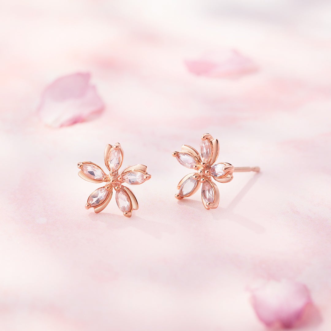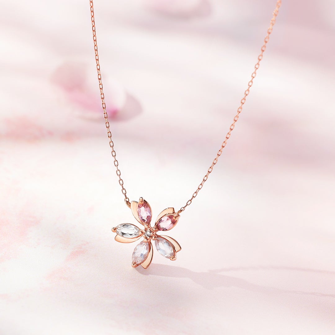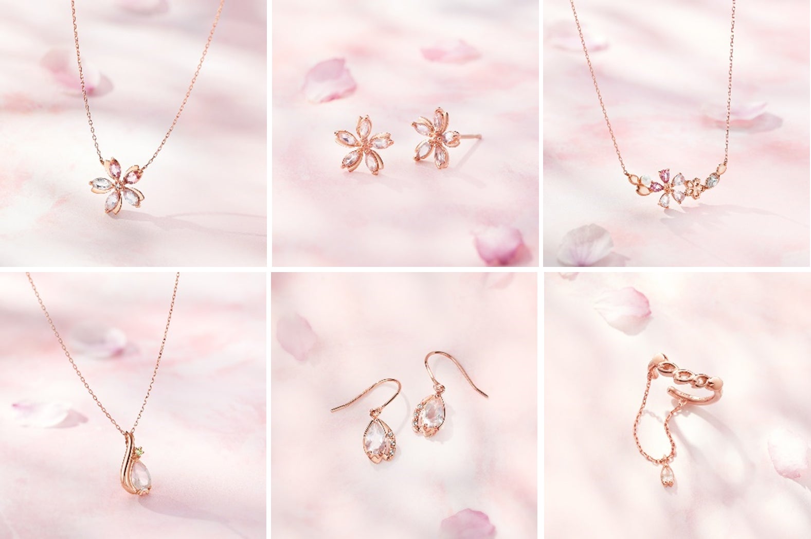 桜をイメージした5枚花のワンポイントモチーフに、ローズクォーツなど春色のカラーストーンを添えたネックレスやピアスが登場。花びらが重なるような繊細なモチーフは、桜の可憐さとともに春風の軽やかさを感じさせてくれます。
