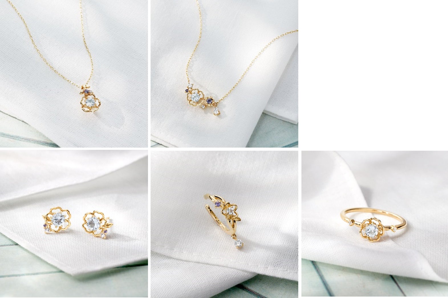春を代表する花として人気の桜や、奥ゆかしく咲くスミレ、一面に広がるネモフィラ、ピュアな印象のマーガレットなど、暖かい季節の訪れを知らせるかわいらしい花々のイメージをジュエリーに落とし込みました。淡いペールカラーのストーンで花々のやさしい表情を描いたジュエリーは、可憐でありながらもEAU DOUCE4℃らしい細かいディテールが華やかさも感じさせてくれます。