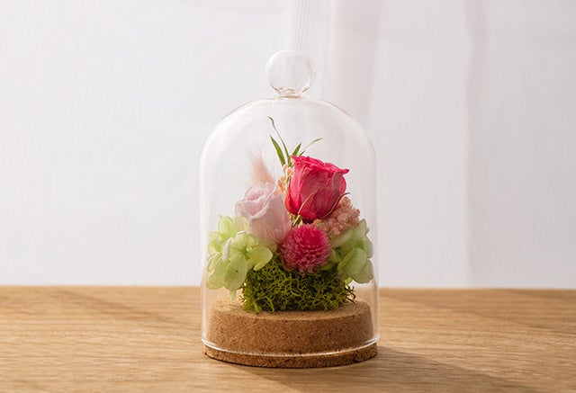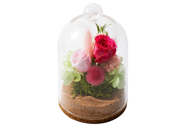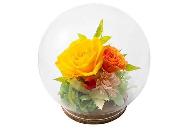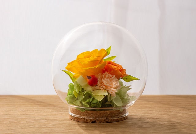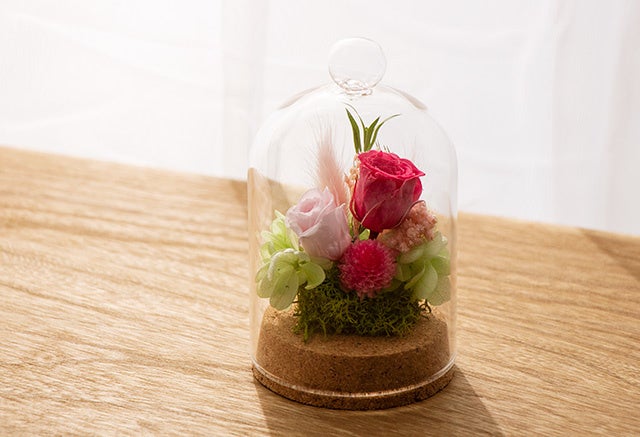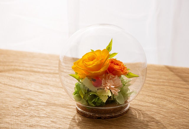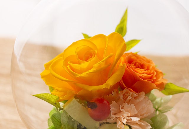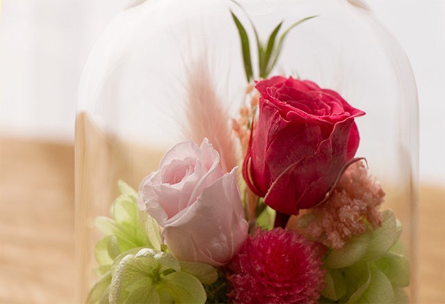 透明度の高いガラスケースだから、花がホコリをかぶらず色合いもクリア。「愛」「すこやか」「絆」の花言葉がある2種のバラのアレンジメントは360°どの角度から見ても美しく、インテリアとして華やかさを演出します。「百華」の甘くて優しい濃淡さまざまなピンクは見る人を幸せな気持ちに包み込み、「黄楊」のオレンジを基調としたビタミンカラーは見る人をより元気な気持ちにします。