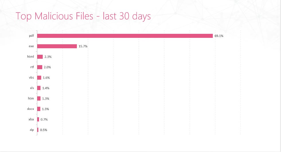 最大の脅威となったPDF:PDFは悪意ある添付ファイルにおける主要な脅威ベクトルとなっており、直近1カ月の集計では、全世界で確認された不正ファイルの約4分の3がPDFでした。電子メールにおけるPDFを悪用した攻撃の割合は、2022年の16%、2023年の20%から大幅に増加しており、その勢いは留まりません。特に医療業界では、悪意あるファイル全体の83%をPDFが占め、悪意あるPDFによる攻撃を最も多く受けた業界となりました。