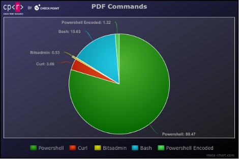 調査の中でCPRは、このエクスプロイトを利用するための悪意あるPDFファイルの作成に用いられる、脅威アクターが持つ複数のビルダーを入手しました。収集されたPDFの大半は、リモートサーバーからペイロードをダウンロードして実行するPowerShellコマンドを実行していましたが、場合によっては別のコマンドが使用されていました。