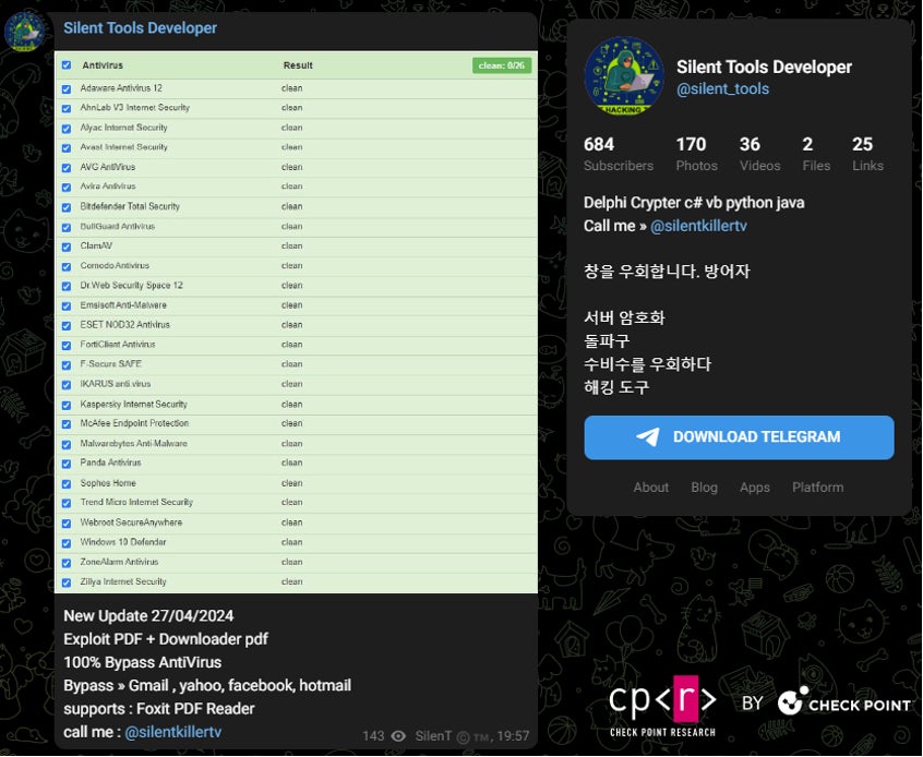 CPRは別のキャンペーンにおいて、脅威アクター@silentkillertvを特定しました。このキャンペーンは2つの連鎖したPDFファイルを利用しており、片方のファイルは正規のウェブサイトであるtrello.comでホストされていました。この脅威アクターは悪意あるツールの販売も行っており、4月27日にはこのエクスプロイトについて広告を行っていました。
