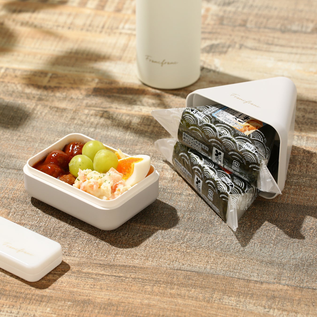 上段はおにぎり、下段にはおかずを入れるのにぴったりなフォルムのランチボックスです。コンパクトなので学校や会社のランチにはもちろん、ピクニックにもおすすめのアイテムです。