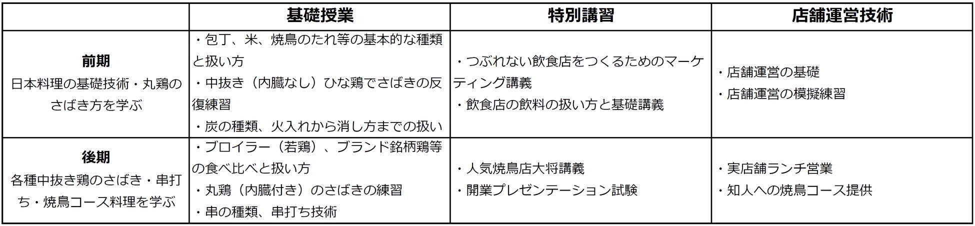寿司、焼鳥、ラーメン、そば・うどんと、世界に誇る日本食の職人を短期実践で養成する調理学校「飲食塾」の第1期「寿司職人コース」(受講期間3カ月)と「焼鳥職人コース」(受講期間2カ月)が10月3日に開校します。この度、焼鳥職人コースのカリキュラムが決定しましたのでお知らせいたします。