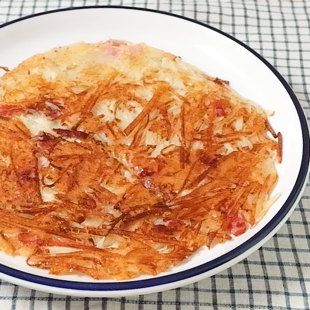 じゃがいもの皮をむき、生のまま千切りにしたら、細切りにしたベーコンと、ピザ用チーズを合わせて、油をひいたフライパンでこんがりと焼くだけです。ベーコンの代わりにツナを入れても美味しいですよ。お酒のおつまみにもなるし、お子さんも喜ぶメニューです。