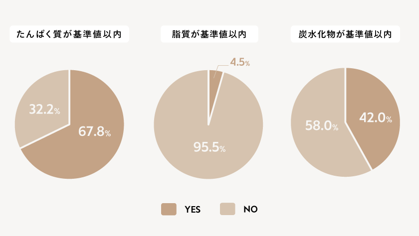 たんぱく質、炭水化物、脂質を基準の範囲内に収めている人はどのくらいいるのか30~49歳の女性10,830名に調査※しました。FiNCの食事記録データでは、たんぱく質は67.8%の人が基準の範囲内になるものの、炭水化物では42%、脂質に至ってはわずか4.5%という結果になりました。脂質や炭水化物の摂取量をコントロールすることは、なかなか難しいことがこのデータからも伺えます。
