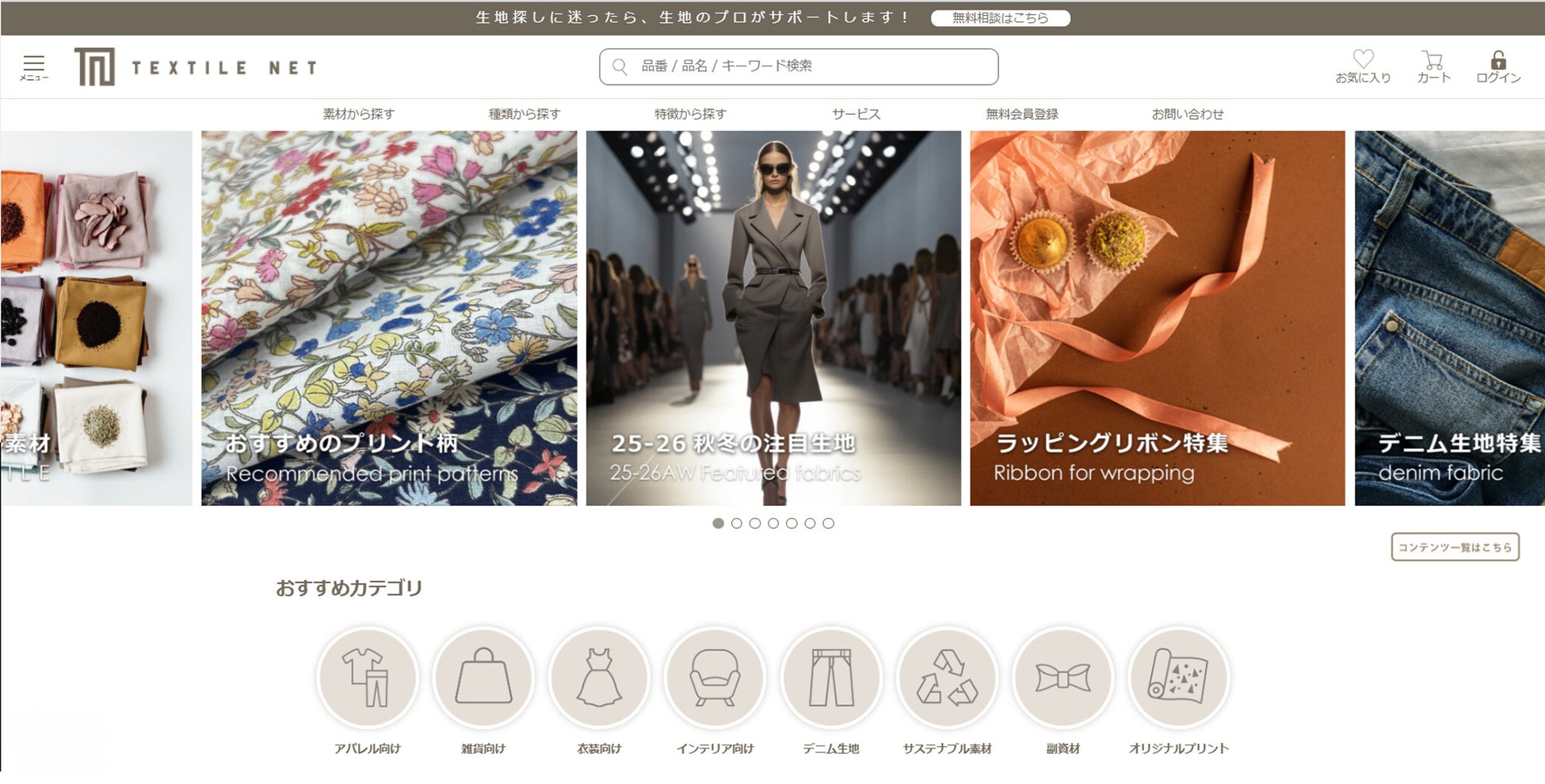 より皆様に使用いただきやすいサイトにすべく、本サイトを利用されるお客様へのアンケートを実施し、この度のリニューアルに至りました。アンケート結果を元に大きく変更した点として、「おすすめカテゴリ」の追加があります。「アパレル向け」「雑貨向け」「衣装向け」「インテリア向け」「デニム生地」「サステナブル素材」「副資材」「オリジナルプリント」の8カテゴリを設けることで、用途・目的に合った生地の検索が可能となります。