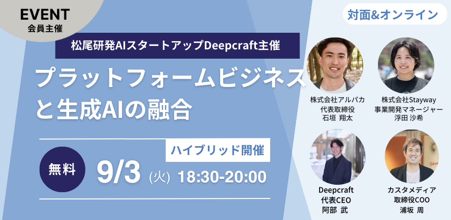 東大松尾研発スタートアップDeepcraft、株式会社アルパカ、株式会社Stayway、カスタメディアで「【新規事業&共創】プラットフォームビジネスと生成AIの融合をテーマの現地交流会を開催します!