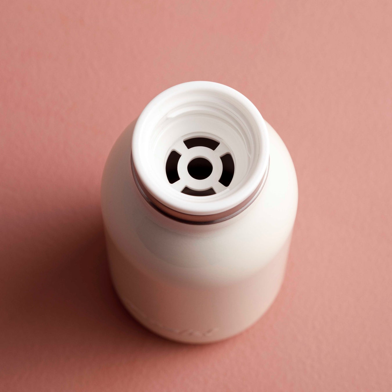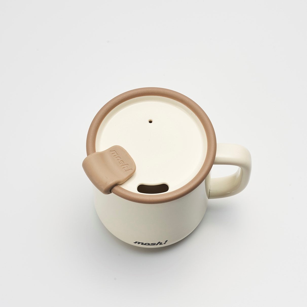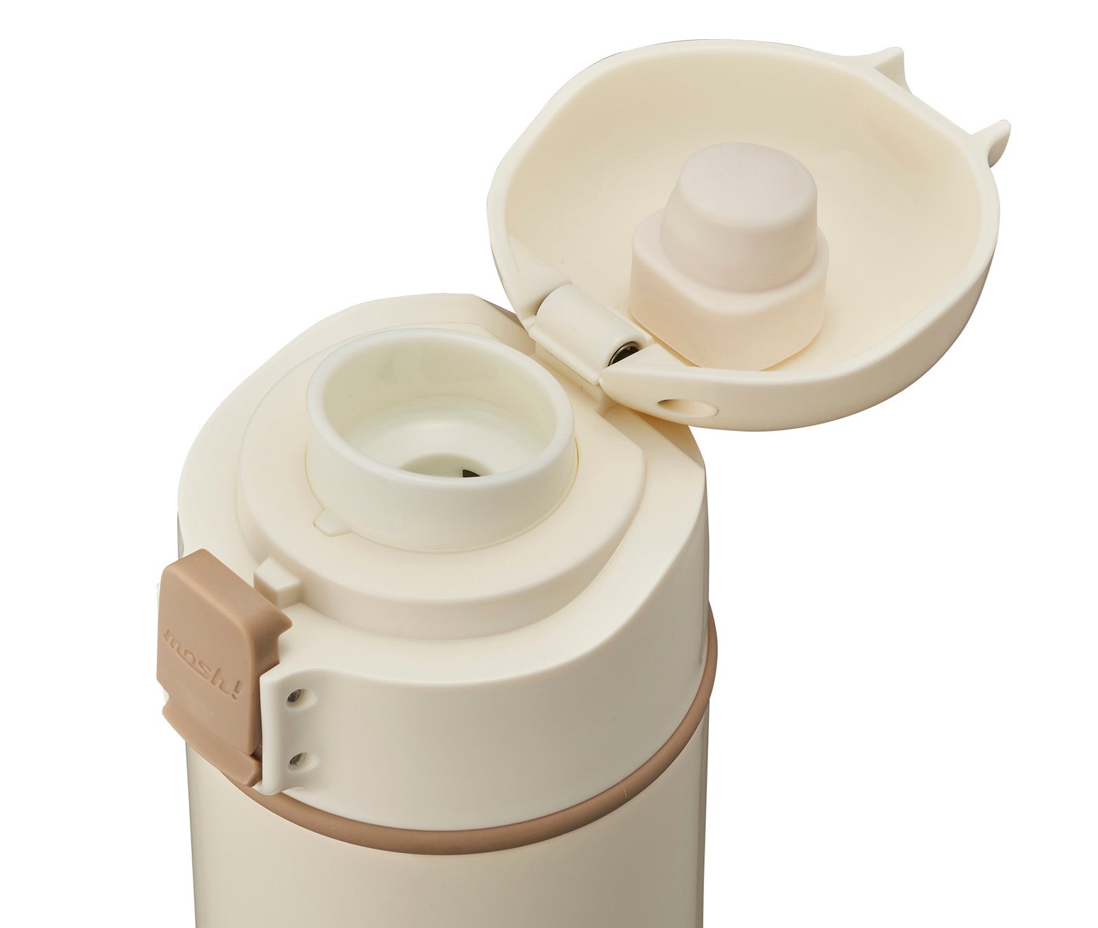 mosh!のブランドアイコンである「!」が刻印されたキャップは従来のミルクステンレスボトルに比べて、雫が垂れにくい構造になっています。