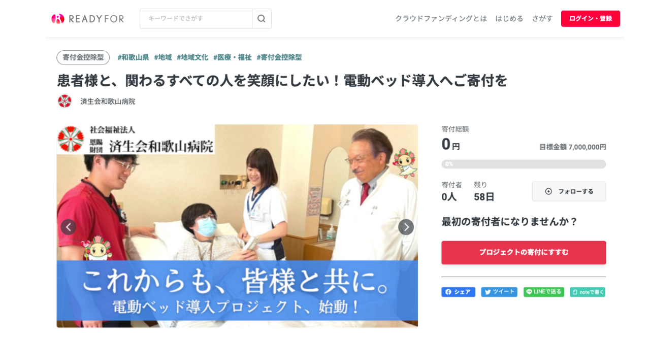 ②済生会和歌山病院|患者様と、関わるすべての人を笑顔にしたい!電動ベッド導入へご寄付を