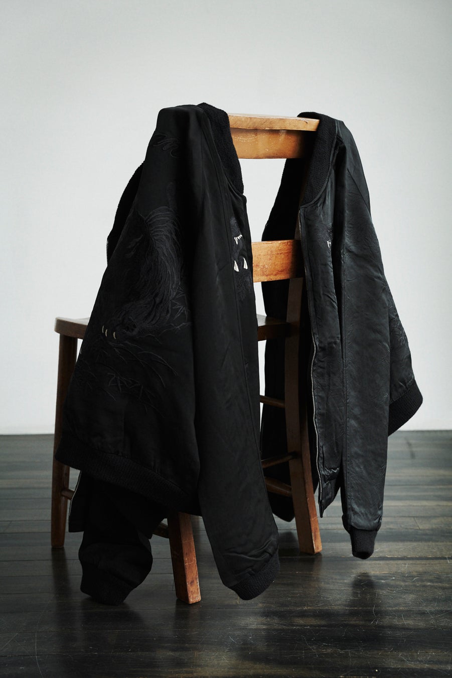 戦後当時、銀座周辺の露店街で、着物や帯など日本の伝統品を土産物として求める米国兵を目の当たりにし、港商の社員が考案したのがオリエンタルな刺繍を施した土産物(スーベニア)としてのジャンパー。 現在では「スカジャン」と呼ばれる日本発祥の洋服が誕生した瞬間です。