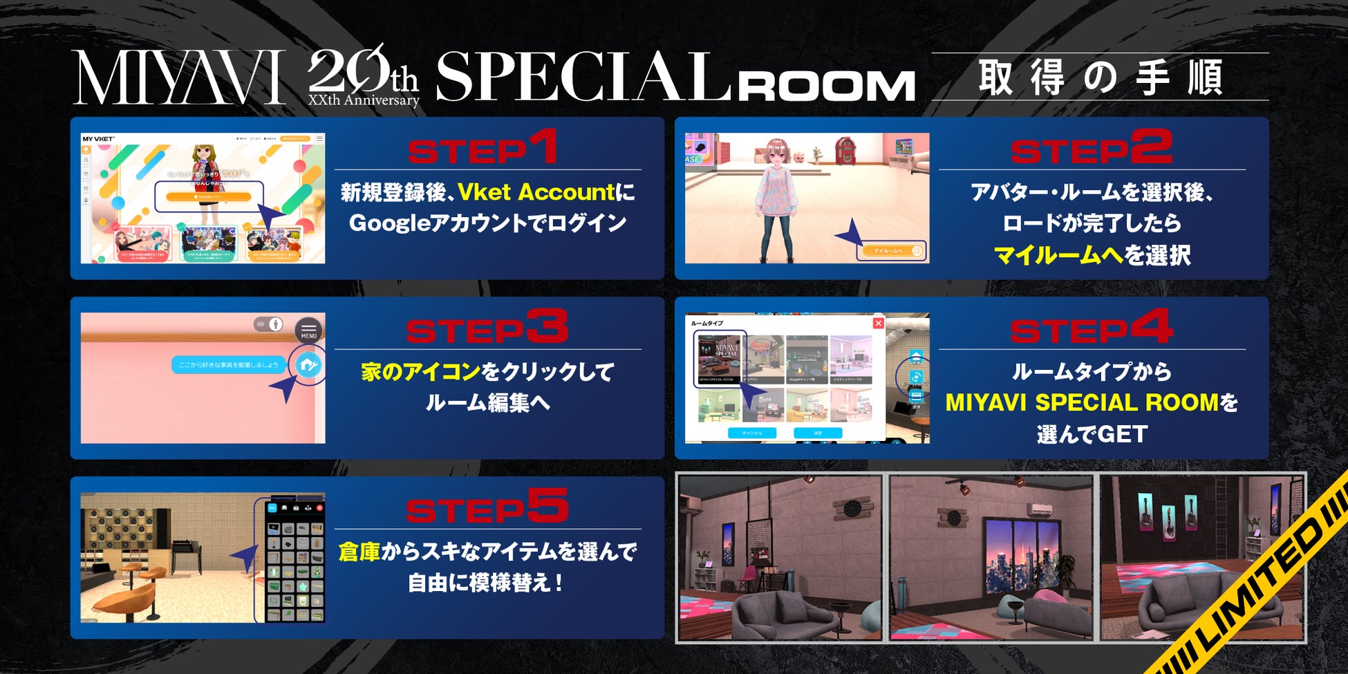 参加方法: My Vket公式Twitter(https://twitter.com/VketCloud)からポストされる本コンテストの投稿に引用リポストする形で、MIYAVIルームをカスタマイズしたマイルームのURLを投稿
