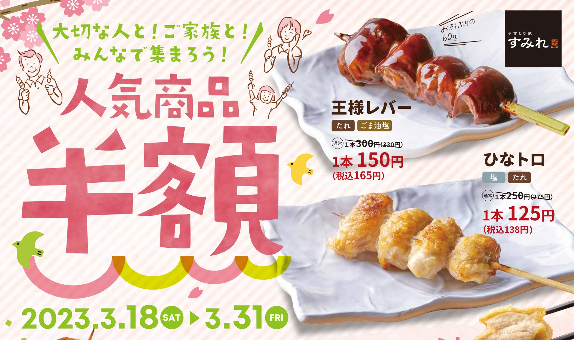 やきとり家すみれ、ハイボール220円、やきとり110円などクーポン掲示で人気商品が半額!脱マスク後の外食は家族や友人と集まって、お得に外食を楽しもう!