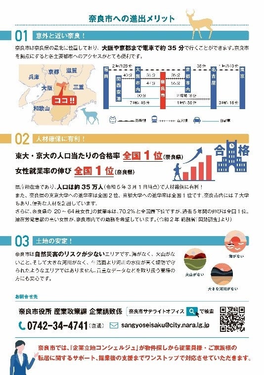 奈良市では、「企業立地コンシェルジュ」が、物件探しから従業員様・ご家族様の転居に関するサポート、大学との連携を含む操業後の支援までワンストップで対応をしています。