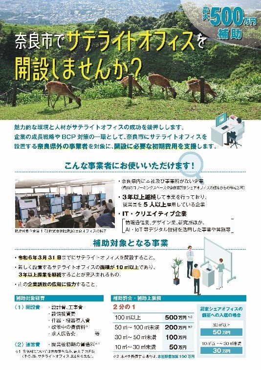 企業の成長戦略や、BCP対策の一環として奈良市に進出する奈良県外のIT・クリエイティブ企業を対象に、開設に必要な初期費用を支援しています。