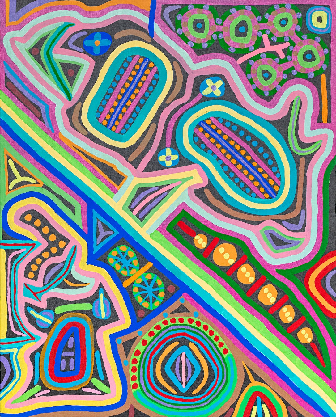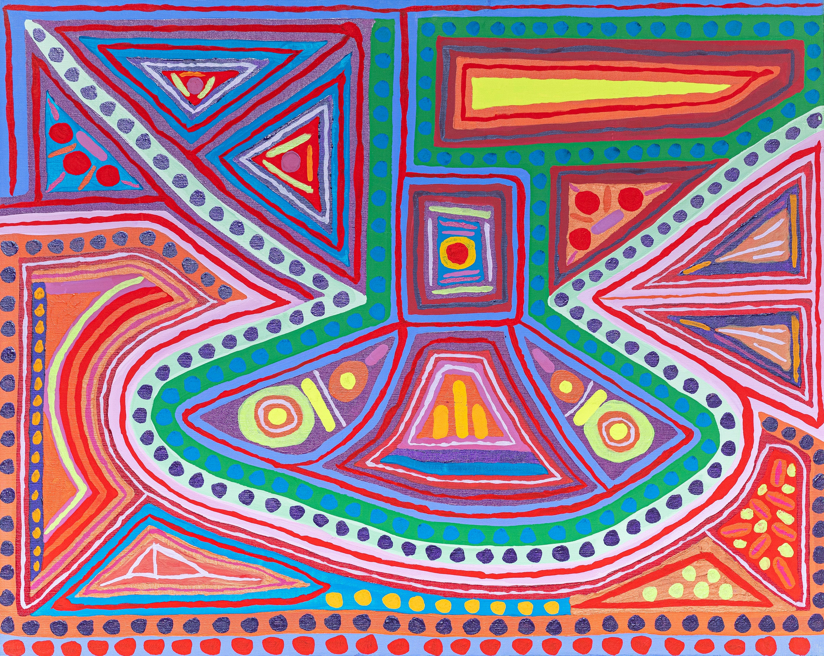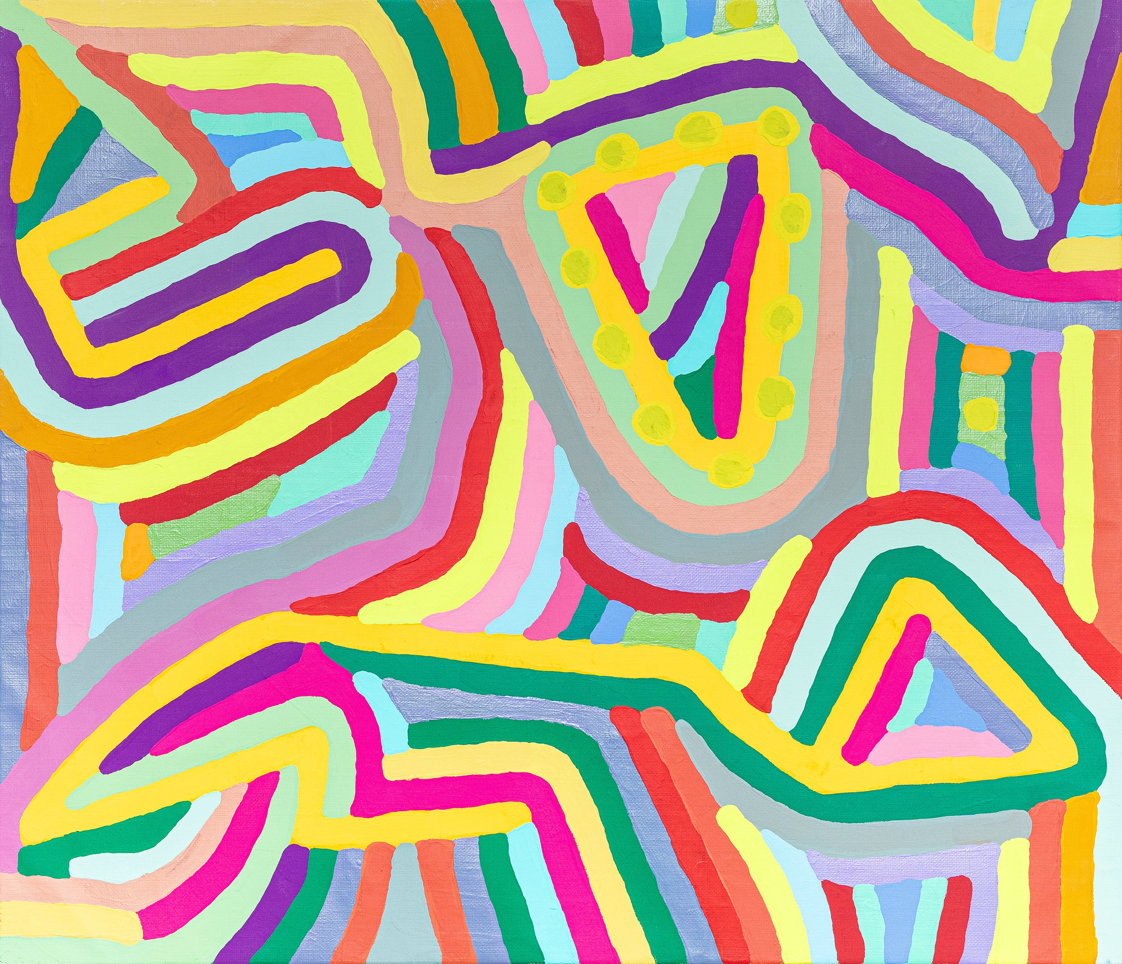 色彩豊かな線や点で、縦横自在に筆を走らせキャンバスを埋め尽くす。それらが織りなす様々なかたちで構成される作品は、一度見たら引き込まれる独特な魅力があります。