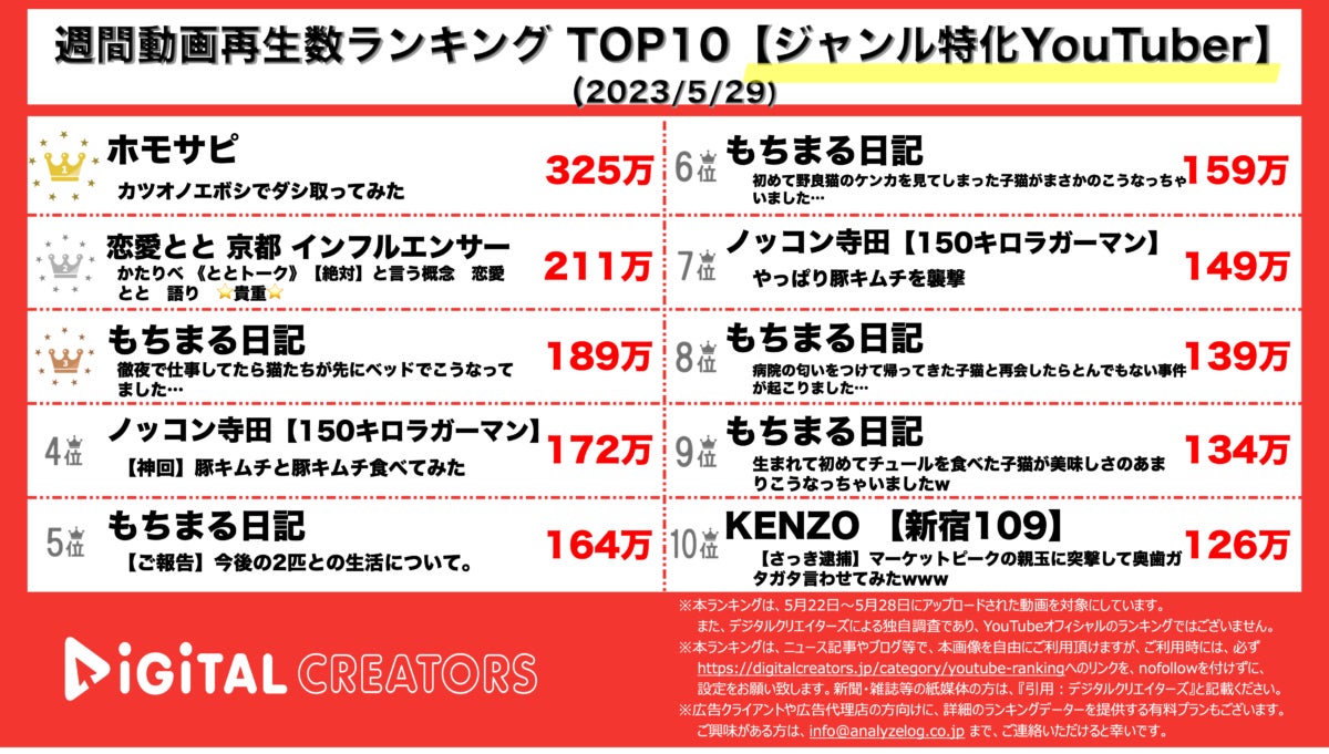 株式会社アナライズログが運営するYouTube分析ツール『Digital Creators(デジタルクリエイターズ)』が独自に調査したYouTube週間動画再生数ランキングTop10を発表します。対象は、5月22日~5月28日にアップされた動画となります。20位までのランキングは下記、デジタルクリエイターズで発表しています。