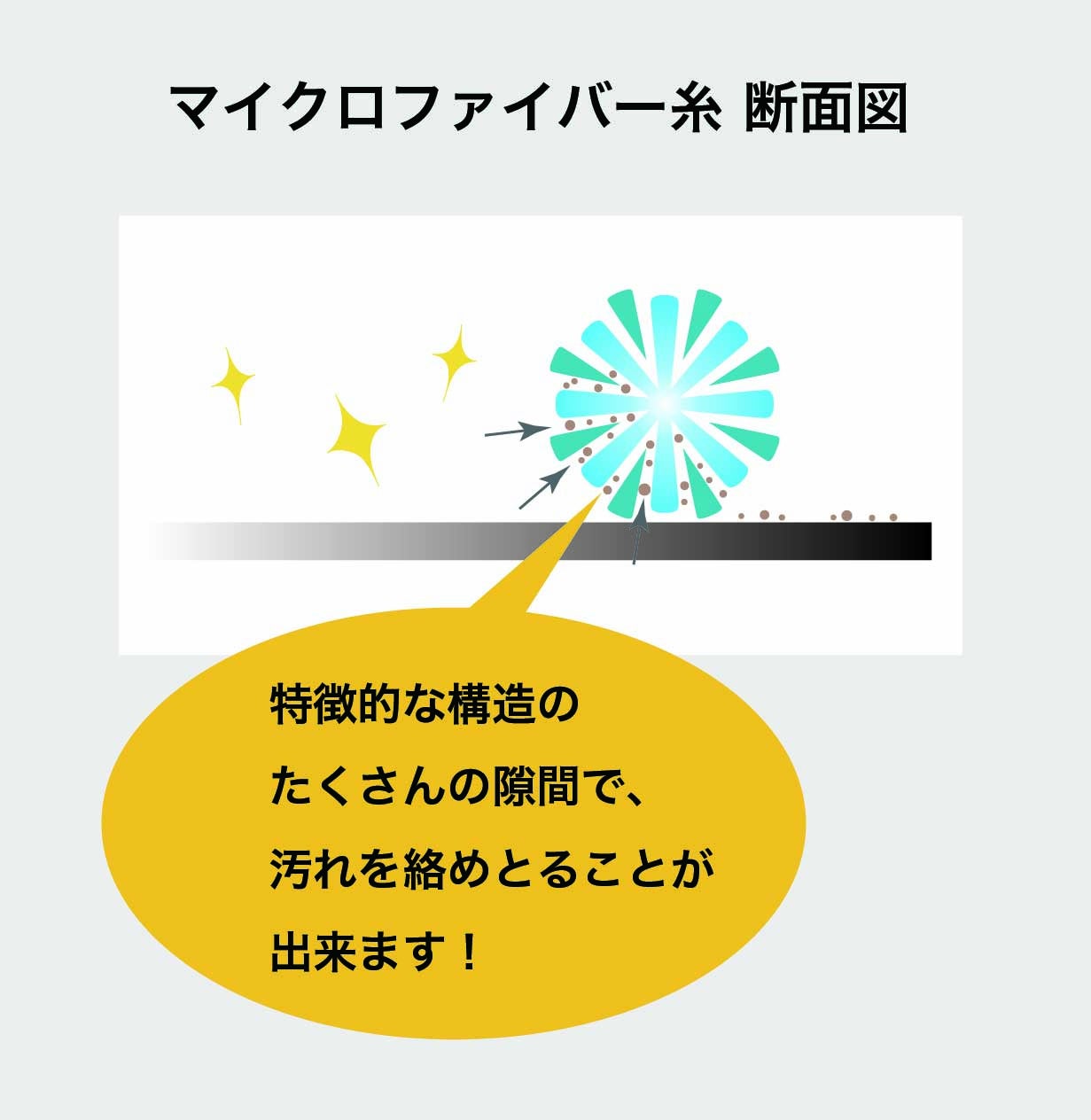 菊の花びらのような、複雑な断面構造のマイクロファイバーが、汚れをしっかり絡めとります。