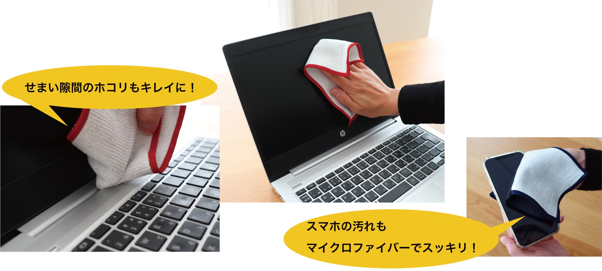 せまい隙間のホコリや、スマートフォンなどの汚れも、マイクロファイバーで拭き取れます。
