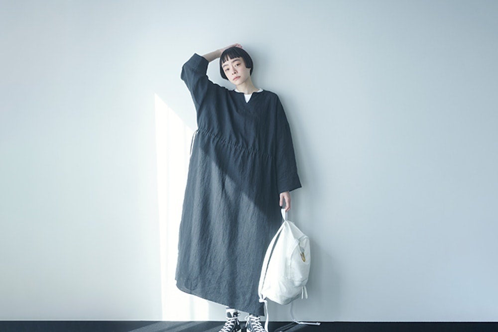 ブラックリネンドレスは、すとんと落ちるiラインにしたことで、身幅はたっぷりなのに、スレンダーにみえるドレスです。鎖骨にそうようにつくられた独特なV字の襟が、エレガントな印象を与えてくれます。ウエストのひもでシルエットを変えれば、いろいろな表情がたのしめて、カジュアルにも、ドレッシーにも似合う、とびきりの1着です。