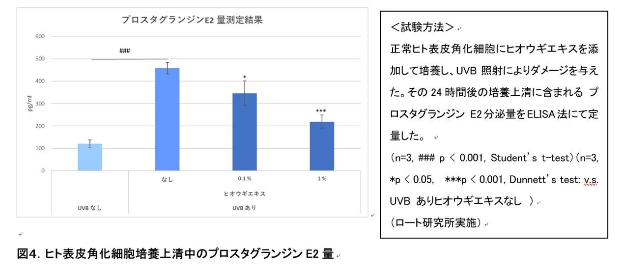 3) UVBダメージで上昇するプロスタグランジンE2の産生をヒオウギエキスが抑制することを確認