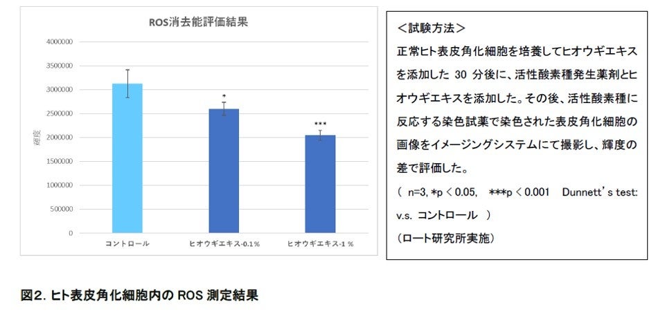 1) ヒト表皮角化細胞において、ヒオウギエキスがROSを抑制することを確認した