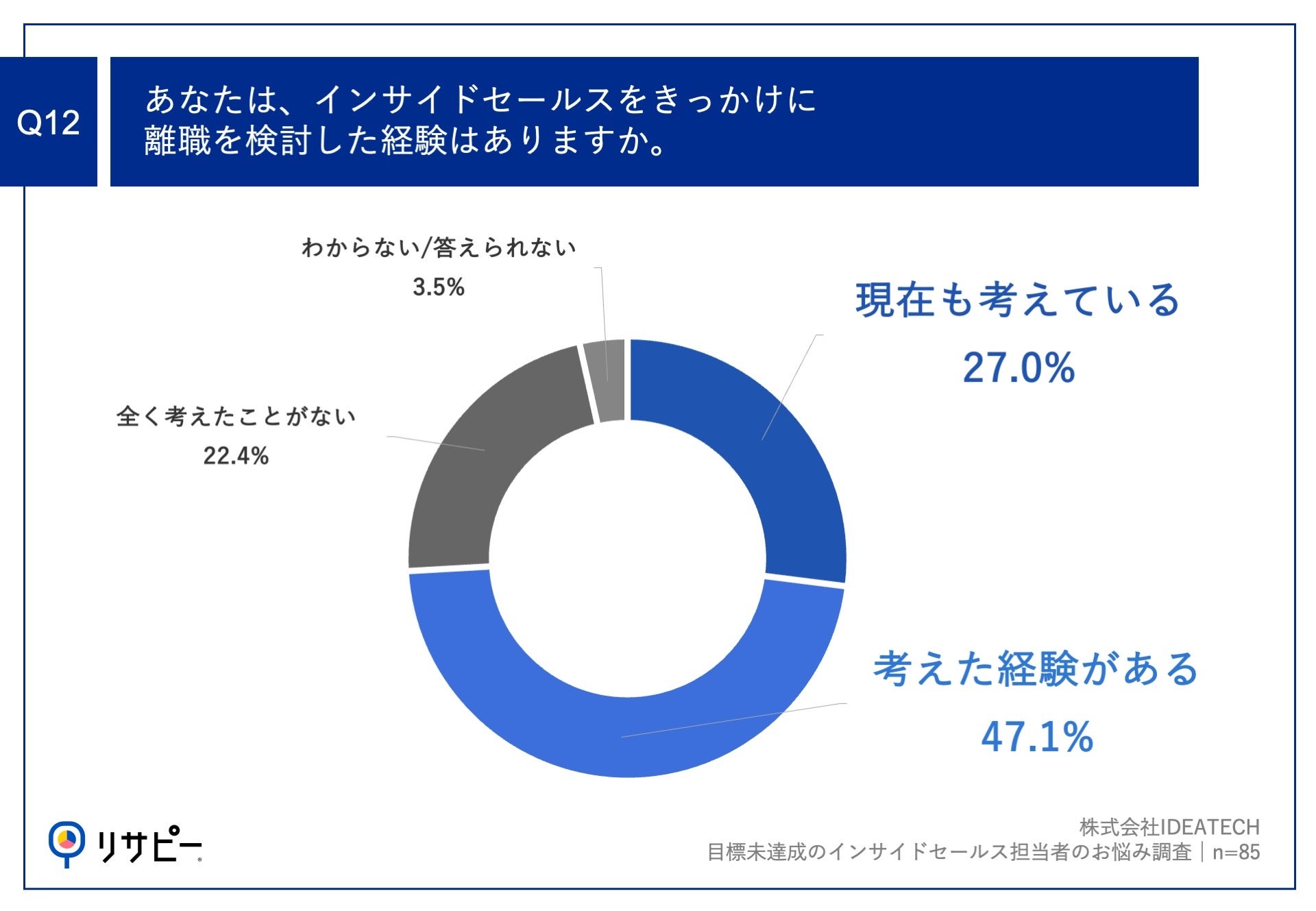 Q10で「特にない」「わからない/答えられない」以外を回答した方に、「Q12.あなたは、インサイドセールスをきっかけに離職を検討した経験はありますか。」(n=85)と質問したところ、「現在も考えている」が27.0%、「考えた経験がある」が47.1%という回答となりました。