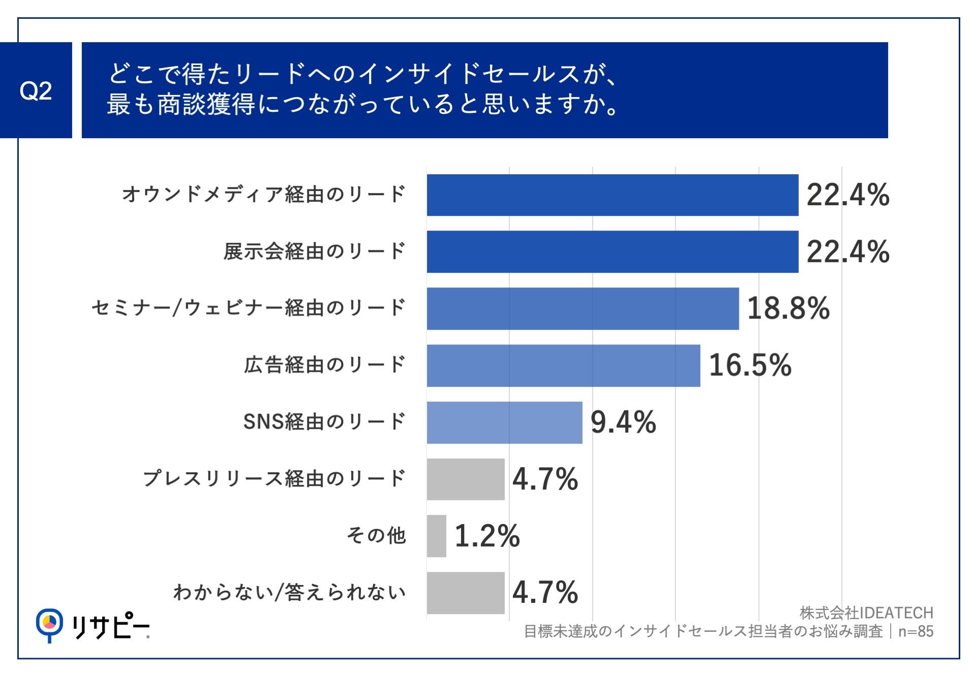 Q1で「わからない/答えられない」以外を回答した方に、「Q2.どこで得たリードへのインサイドセールスが、最も商談獲得につながっていると思いますか。」(n=85)と質問したところ、「オウンドメディア経由のリード」が22.4%、「展示会経由のリード」が22.4%、「セミナー/ウェビナー経由のリード」が18.8%という回答となりました。